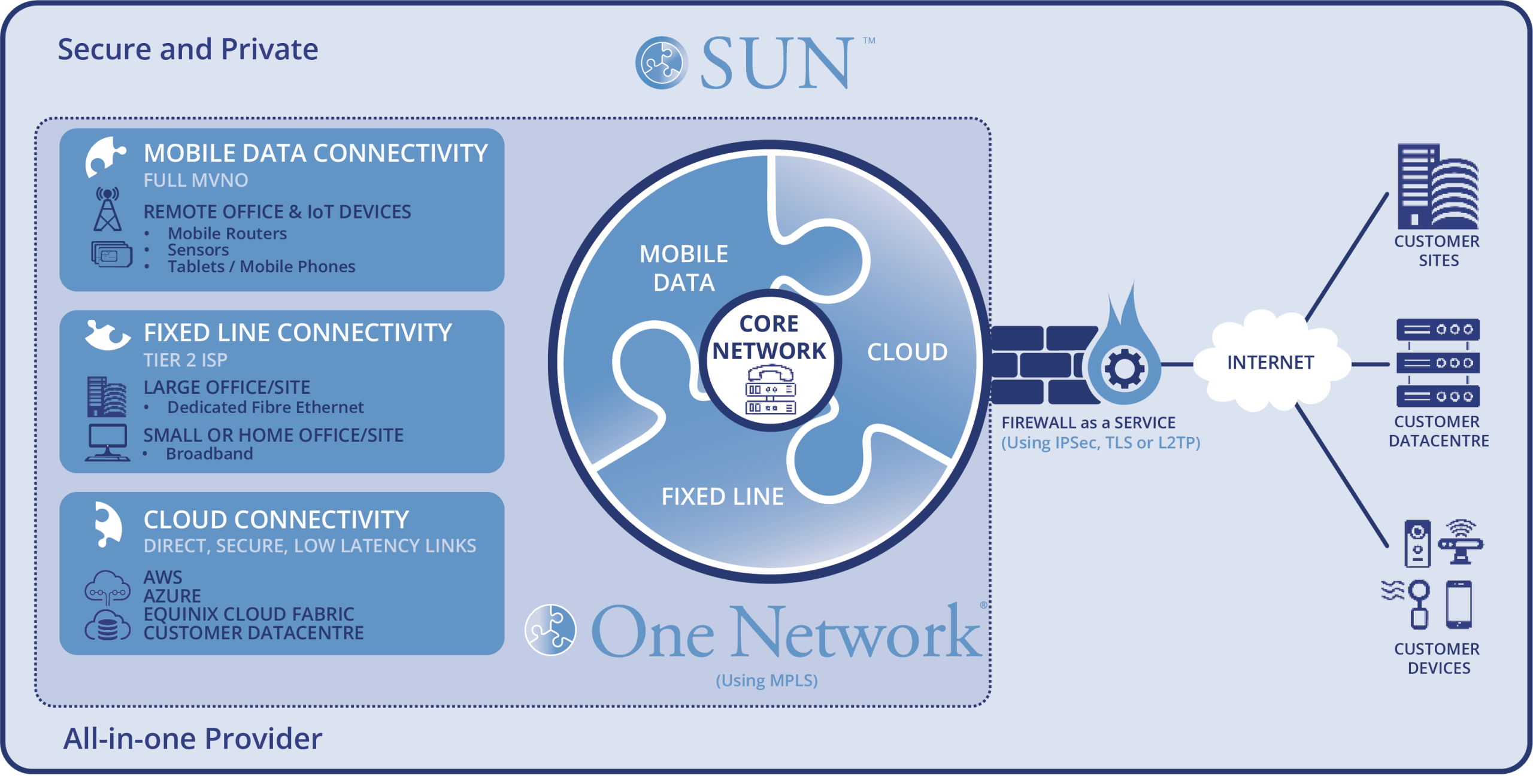 With One Network you can now seamlessly integrate IoT devices, servers and users with mobile SIMs, fixed line fibre and cloud connectivity over a secure private MPLS network, without exposure to the public Internet and therefore without the need for encryption algorithms and IP Sec VPN tunnels.